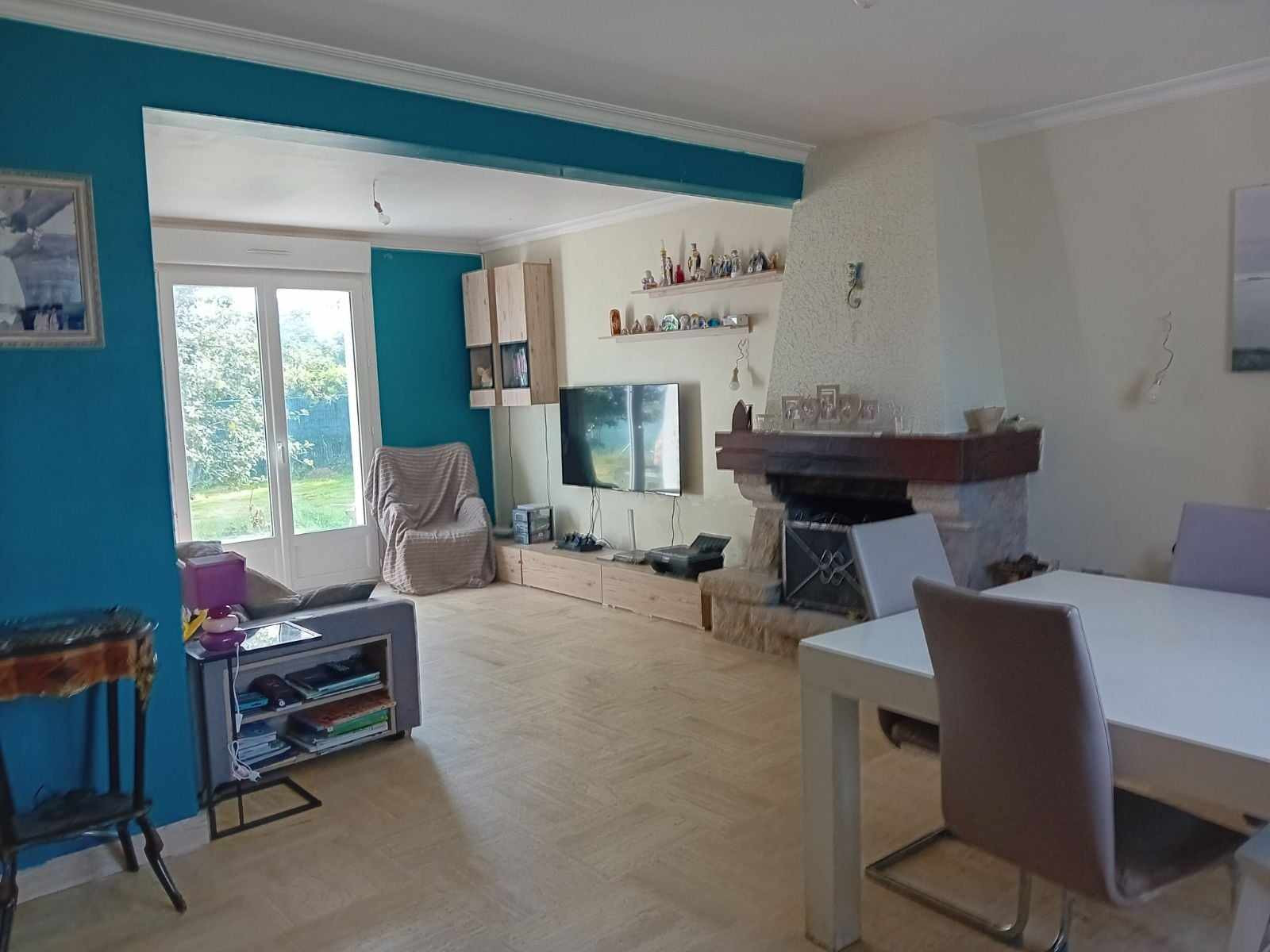 GUISSENY : Maison traditionnelle comprenant une cuisine aménagée et équipée, salon séjour avec cheminée , une chambre avec salle d'eau; à l'étage : placard, 3 chambres, salle de bains. Garage avec une pièce au-dessus.