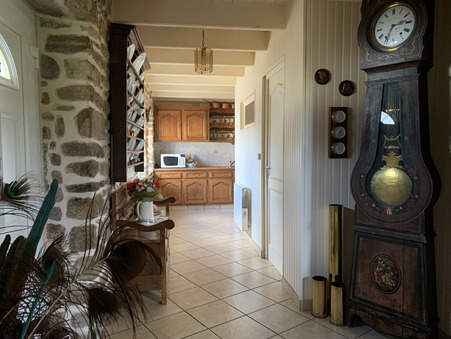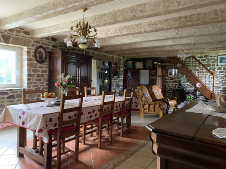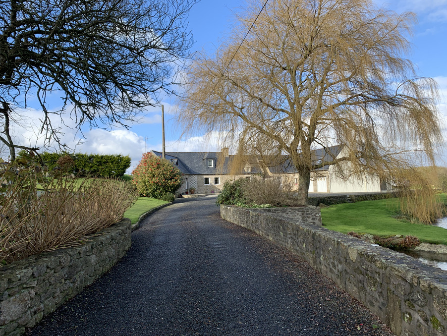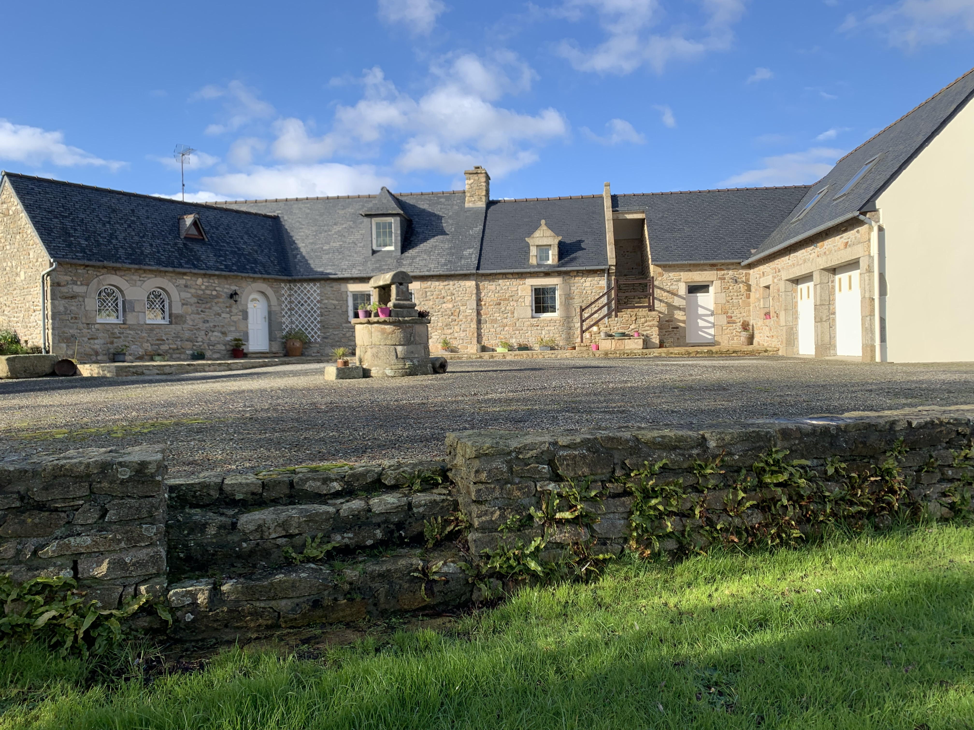 PLOUGUERNEAU : Dans un cadre campagnard et non loin de la mer, propriété de charme s'ouvrant sur un étang et un jardin paysagé, disposant d'un vaste salon-séjour avec cheminée, d'une cuisine aménagée et équipée, d'une chambre, d'une salle de bains; à l'étage : mezzanine bureau, trois chambres. Garage avec buanderie et grenier. Possibilité de réhabilitation du garage.