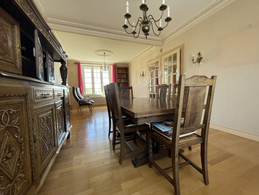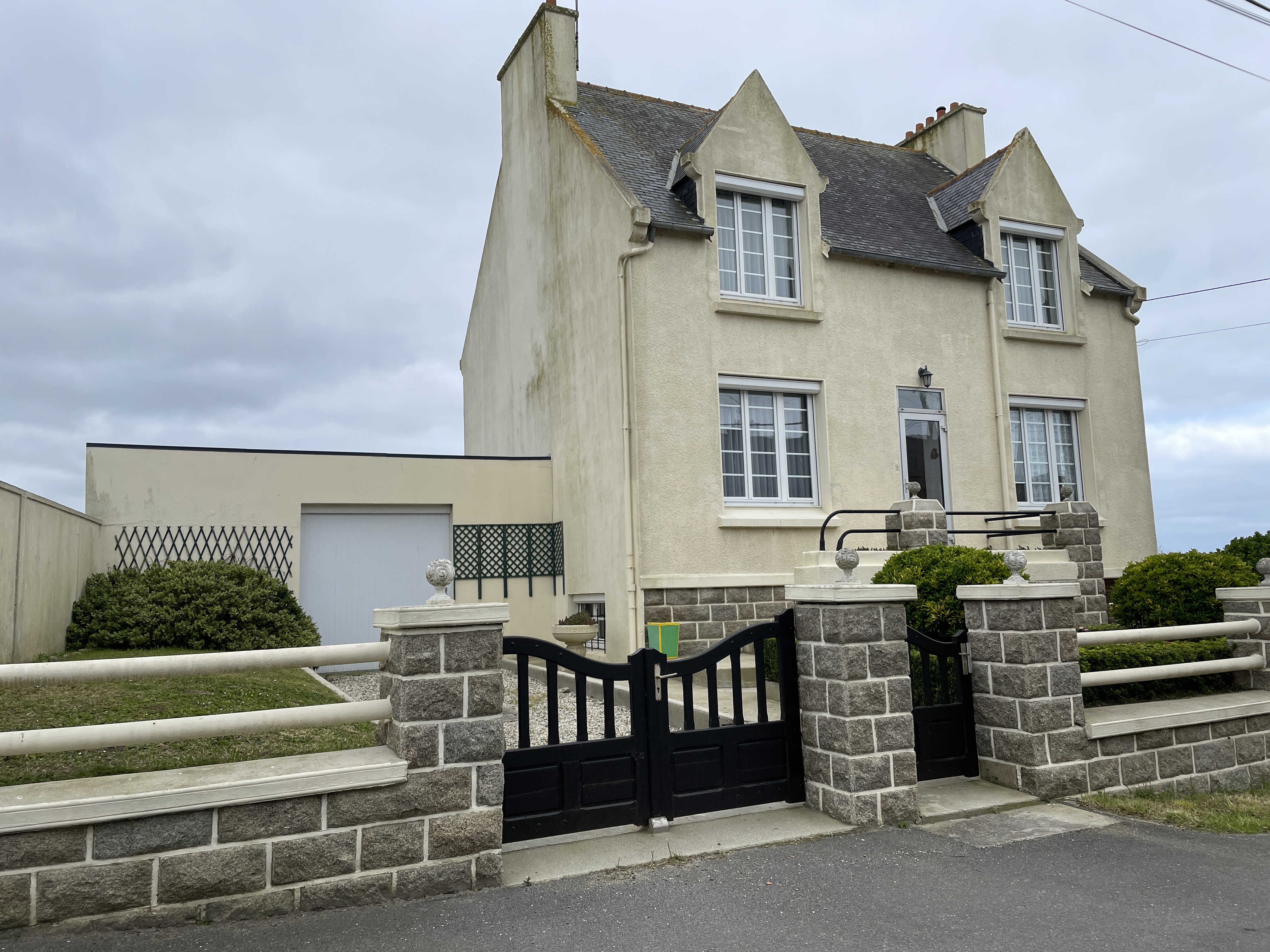 PLOUGUERNEAU : Proximité bourg et en direction des plages. Maison traditionnelle en pierre sur cave comprenant un garage, un atelier, une chaufferie et une pièce; au RDC surélevé : une cuisine, un salon séjour , salle de bains; à l'étage : 4 chambres.